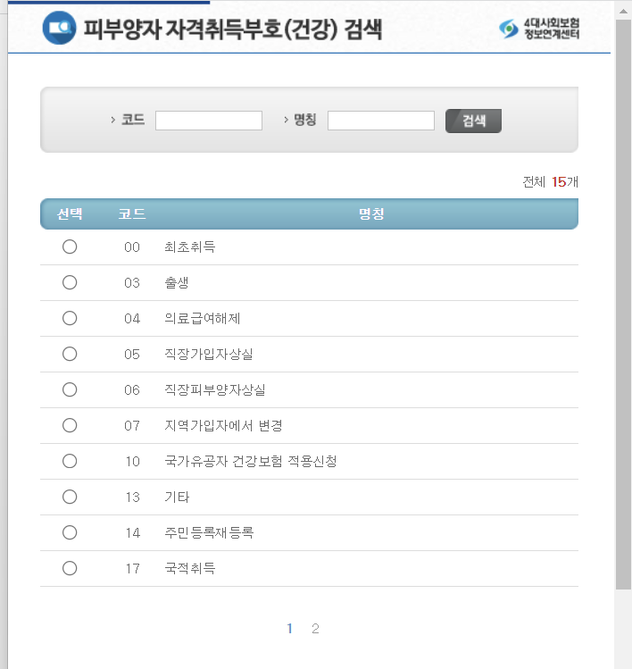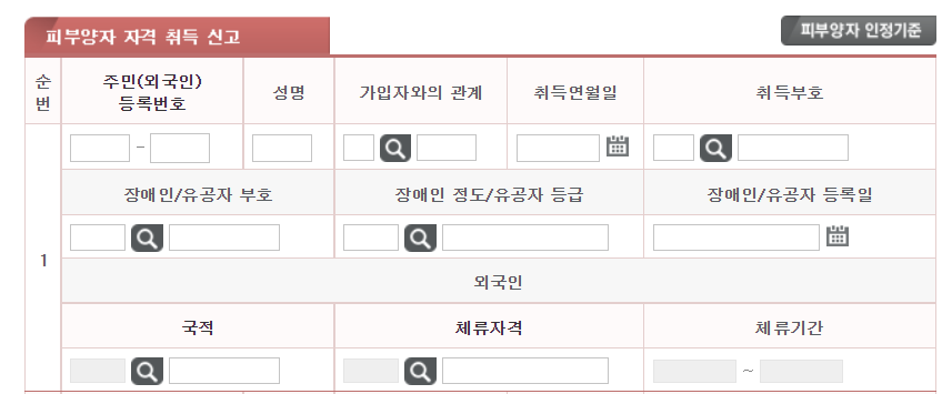 4. 피부양자로 등록할 분의 정보를 입력해주세요. 취득연월일은 만약 직장가입자 상실이라면 취득 부호에 5번을 선택 후 피부양자가 직장가입자로 상실한 다음날로 입력해주면 됩니다.