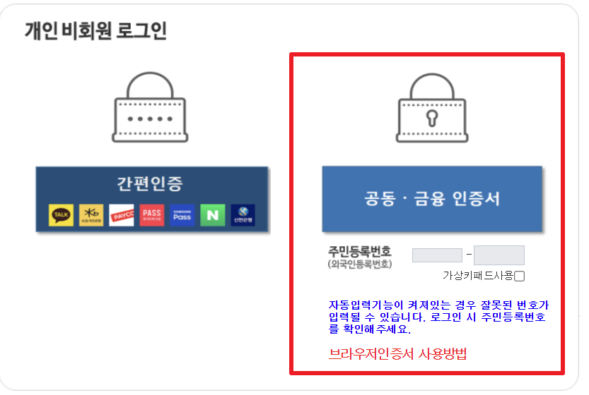 간편 인증으로는 등록이 불가능하니 꼭 공동, 금융인증서로 진행해야 합니다.