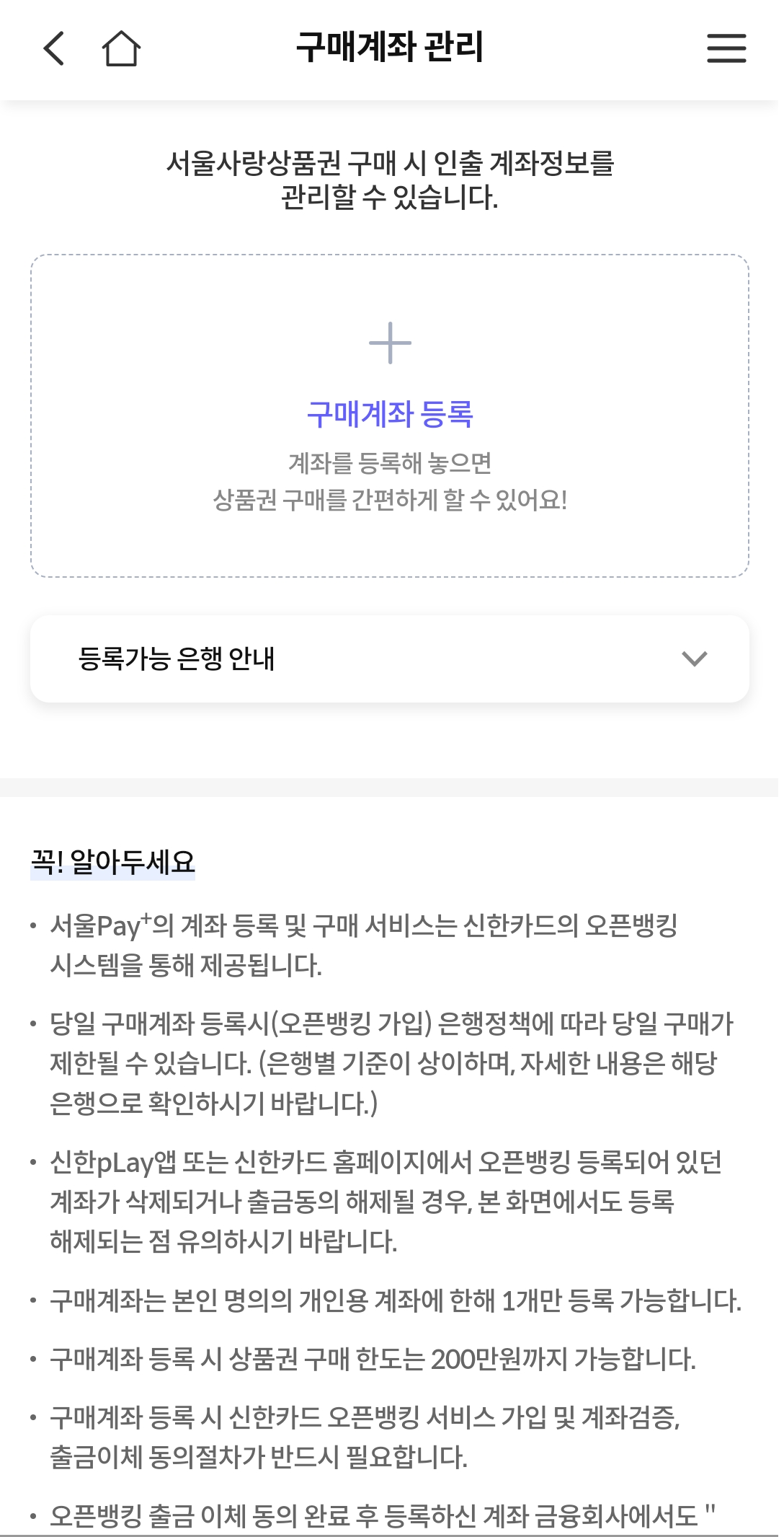 3. 이전에 사용한 적이 없다면 구매계좌 등록이 안되어있을텐데요. 구매계좌를 미리 등록해야 당일날 바로 결제하실 수 있겠죠. 구매계좌 등록하기를 진행합니다.
